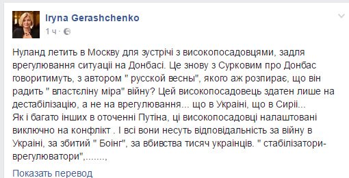 “Нуланд летит в Москву для встречи с высокопоставленными должностными лицами для урегулирования ситуации на Донбассе. Это опять с Сурковым о Донбассе говорить, с автором "русской весны"? Этот чиновник способен лишь на дестабилизацию”, - написала в своем Facebook Геращенко.
