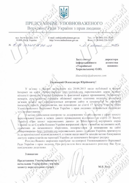 "В соответствии со статьей 23 закона "О защите персональных данных" в МВД и СБУ направлены письма с требованием установить лиц, причастных к незаконному хранению, использованию и распространению на сайте "Миротворец" персональных данных граждан Украины, привлечь их к уголовной ответственности, а также предпринять меры для блокирования доступа к этому интернет-ресурсу", - говорится в ответе.