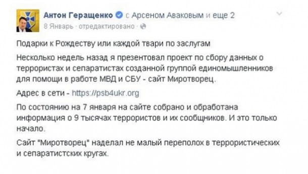 Ранее о своей причастности к созданию сайта Миротворец заявлял народный депутат и советник министра внутренних дел Антон Геращенко.