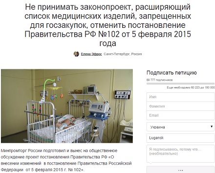 В петиции звучат слова категорического протеста относительно принятия таких необдуманных и опасных поправок. Авторы петиции требуют пересмотрения постановления властей №102 от 5 февраля 2015 г. "Об установлении ограничения допуска отдельных видов медицинских изделий, происходящих из иностранных государств, для целей осуществления закупок для обеспечения государственных и муниципальных нужд".