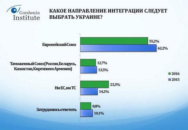 Так что, 55,2% опрошенных отметили, что Украина должна интегрироваться в ЕС, а 12,7% - не прочь плотно сотрудничать с Таможенным союзом.