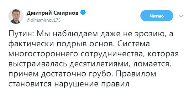 По словам российского лидера, отсутствие правил становится нормой. Если и дальше так пойдет, то в международных отношениях все будет решать исключительно сила.