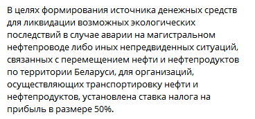 В пресс-службе президента Белоруссии подчеркнули, что повышение ставки налога на прибыль, которая после вступления в силу указа, составит 50%, обусловлена стремлением Минска защитить экологическую ситуацию в стране в случае возможных экологических катастроф или других видов ЧП в случае аварий на нефтепроводе.