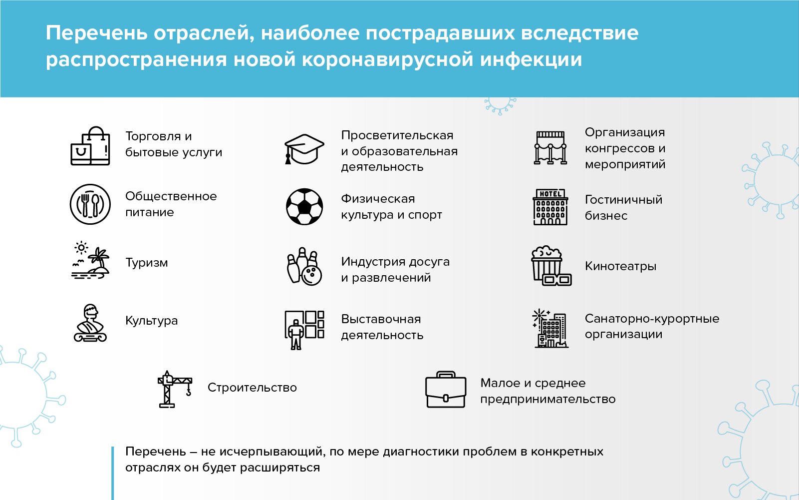 В свою очередь, президент России Владимир Путин во время совещания с правительством заявил, что в перечень наиболее пострадавших отраслей следует также добавить малые и средние компании, которые ведут торговлю непродовольственными товарами. По словам главы государства, у них сейчас также хватает проблем.