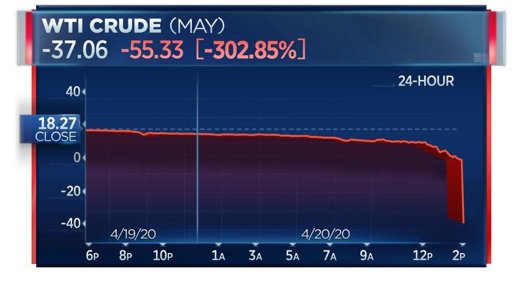 На момент написания данной новости цена американского сырья уже преодолела отметку практически в -40 долларов США за один баррель. По всей видимости стоимость фьючерса WTI не остановится на этом и продолжит свое стремительное падение.