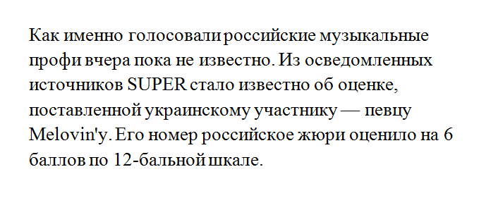 Какие именно оценки представители России выставляли конкурсантам в полуфинале, пока неизвестно. Однако источники Super утверждают, что члены российского жюри оценили выступление украинского исполнителя Melovin'а на 6 баллов по 12-балльной шкале.