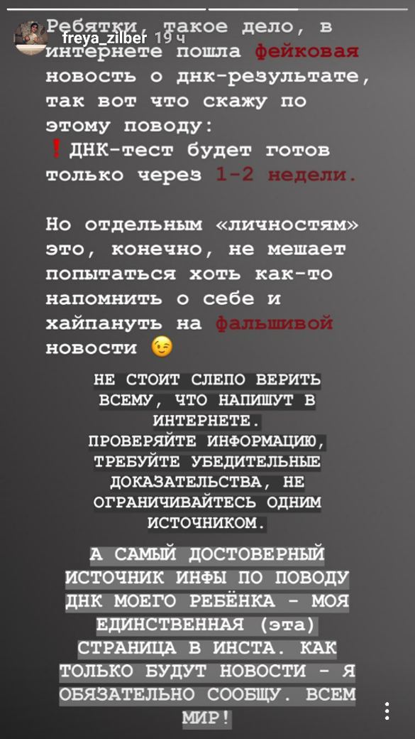 На своей официальной странице в социальной сети "Инстаграм" в "Инстасториз" Зильбер подчеркнула, что тест будет готов через 1-2 недели, поэтому доверять подобным новостям не стоит.