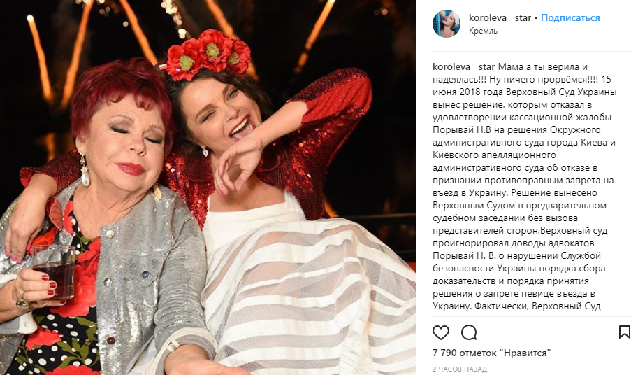 Российская исполнительница Наташа Королева прокомментировала отказ своей кассационной жалобы на запрет о ее въезде на территорию Украины, сообщает "Российский Диалог".