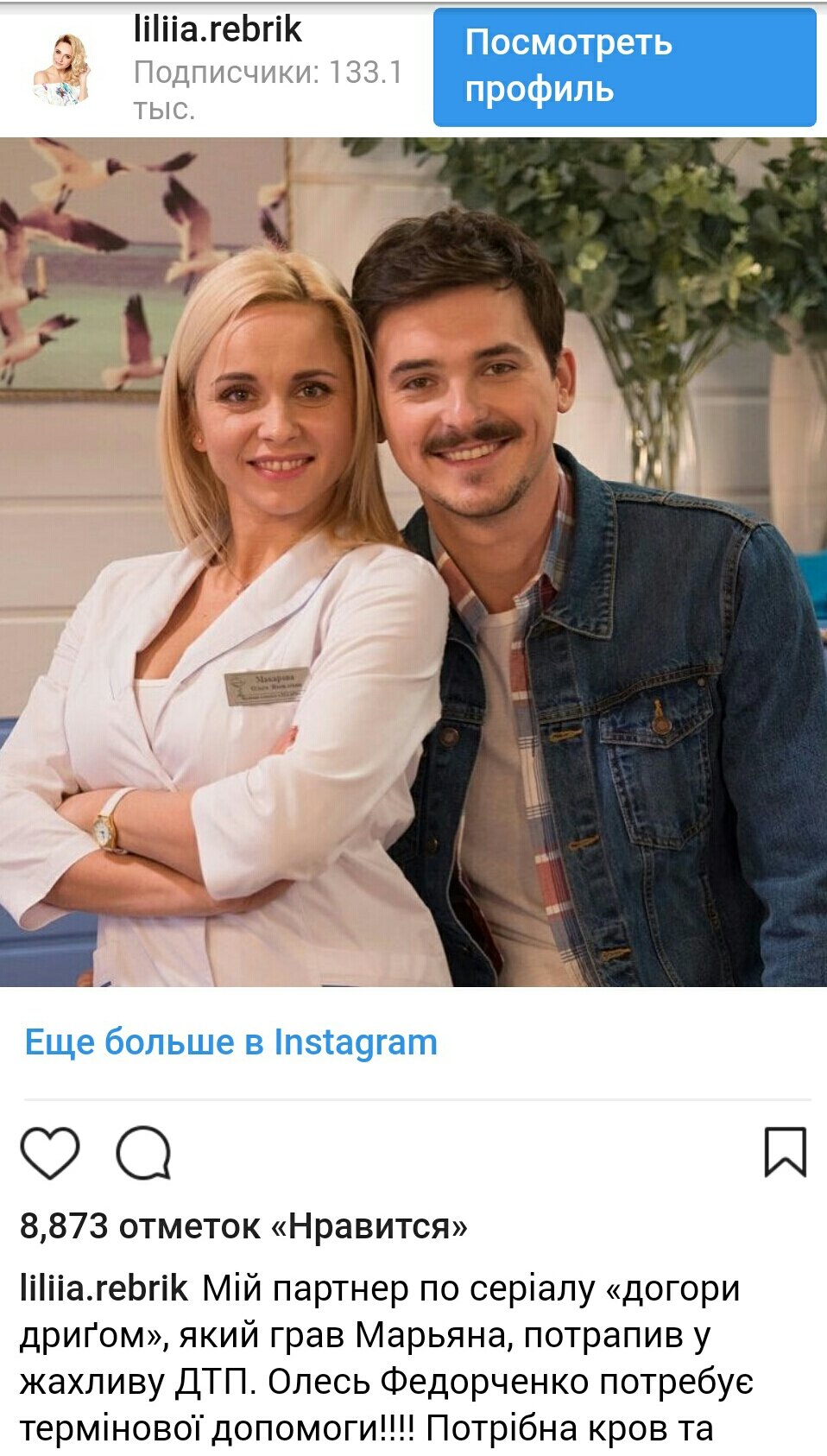 "Мой партнер по сериалу "Вверх тормашками", который играл Марьяна, попал в жуткое ДТП. Олесь Федорченко нуждается в срочной помощи! Нужна кровь и деньги!" – написала звезда на украинском языке.