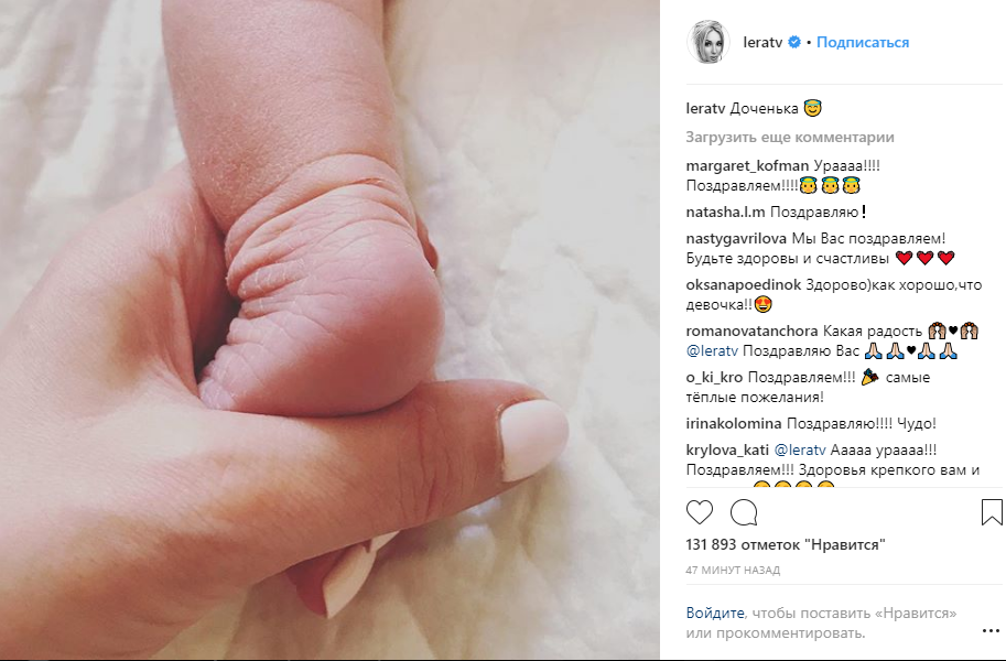 Долгожданное и радостное событие она обнародовала в соцсетях, показав фотографию, на которой ее рука держит маленькую ножку новорожденной, сообщает "Российский Диалог".