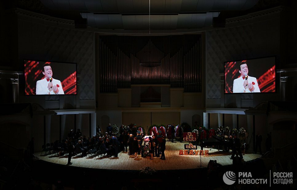 Гроб установили на сцене, он находится в окружении венков. Позади показываются портреты Кобзона, из динамиков звучит его голос.