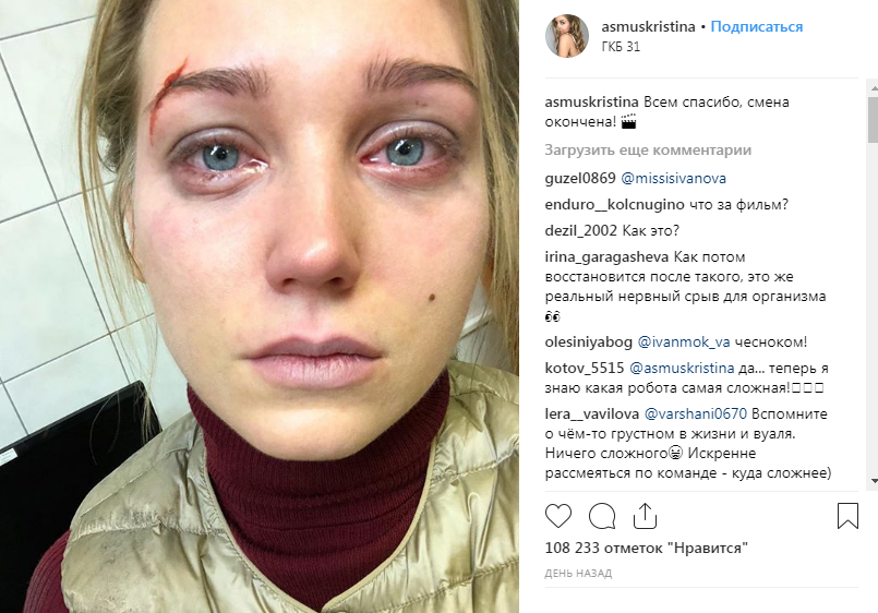 На своей официальной странице в социальной сети "Инстаграм" российская артистка, известная ролью Варей Черноус из сериала "Интерны", выставила новую фотографию. На кадре Кристина предстала с побитым бледным лицом и заплаканными глазами. Интригующей оказалась и подпись к фотографии: "Всем спасибо, смена окончена!" - написала знаменитость.