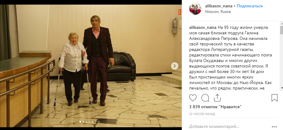 На своей официальной странице в социальной сети "Инстаграм" Бари выставил фотографию с 94-летним литературным редактором Галиной Петровой. Оказалось, что она умерла.
