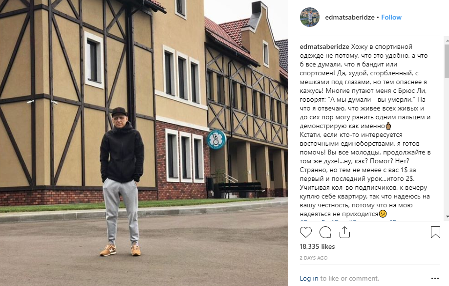"Да, худой, сгорбленный, с мешками под глазами, но тем опаснее я кажусь! Многие путают меня с Брюсом Ли, говорят: а мы думали, вы умерли", – написал на своей официальной странице в социальной сети "Инстаграм" Мацаберидзе.