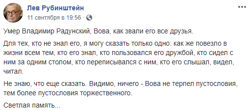 На своей официальной странице в социальной сети "Фейсбук" российский поэт и публицист Лев Рубинштейн поведал печальное известие. 11 сентября из жизни ушел оформитель детских книг Владимир Радунский. Причины скоропостижной смерти 64-летнего иллюстратора остаются неизвестными.