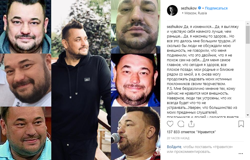 "Да, я изменился... Да, я выгляжу и чувствую себя намного лучше, чем раньше... Да, я наконец-то здоров... Но все это далось мне большим трудом..." - подписал публикацию Сергей Жуков.