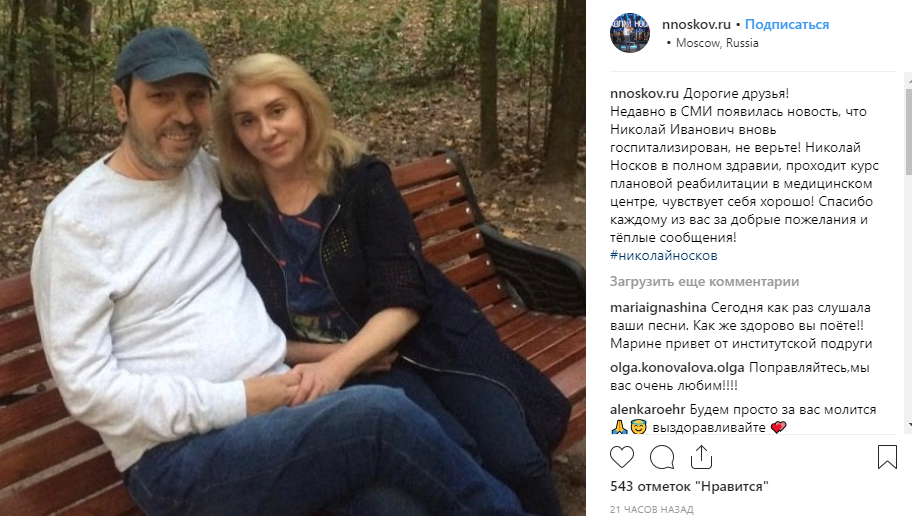 "Недавно в СМИ появилась новость, что Николай Иванович вновь госпитализирован, не верьте! Николай Носков в полном здравии, проходит курс плановой реабилитации в медицинском центре, чувствует себя хорошо!" - написала Марина под фотографией.