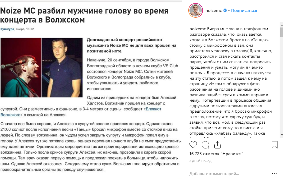 На своей официальной странице в социальной сети "Инстаграм" артист самостоятельно раскрыл все детали недавнего происшествия. Оказалось, во время его выступления в городе Волжском певец бросил стойку с микрофоном в фан-зону, где стояли его поклонники. Но предмет не успели словить, и он травмировал некого Алексея.