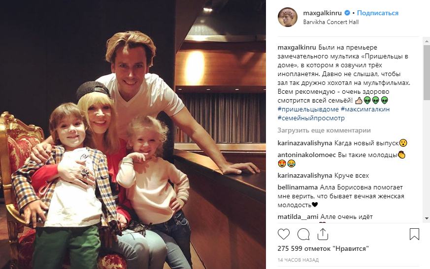 Вместе с самыми близкими людьми Алла Борисовна появилась на специальном показе мультфильма "Пришельцы в доме". Как выяснилось, Галкин сам принимал участие в мультике, став голосом для трех инопланетян: