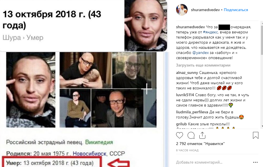 "Что за *** (ерунда) очередная, теперь уже от #яндекс, вчера вечером телефон разрывался как у меня, так и у моего директора и адвоката, я жив и здоров, что называется, не дождетесь. Спасибо за "заботу" и "своевременное" оповещение!" - высказался на своей официальной странице Шура.