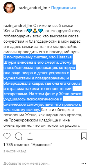 На своей официальной странице в социальной сети "Инстаграм" Разин открыто сказал о том, кого считает виноватым в смерти своего друга и исполнителя Евгения Осина. По его мнению, Наталья Штурм ради денег и пиара травила и спаивала артиста.