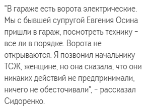 "В гараже есть ворота электрические. Мы с бывшей супругой Евгения Осина пришли в гараж посмотреть технику – все ли в порядке. Ворота не открываются. Я позвонил начальнику ТСЖ, женщине, но она сказала, что они никаких действий не предпринимали, ничего не обесточивали", – высказался концертный директор.