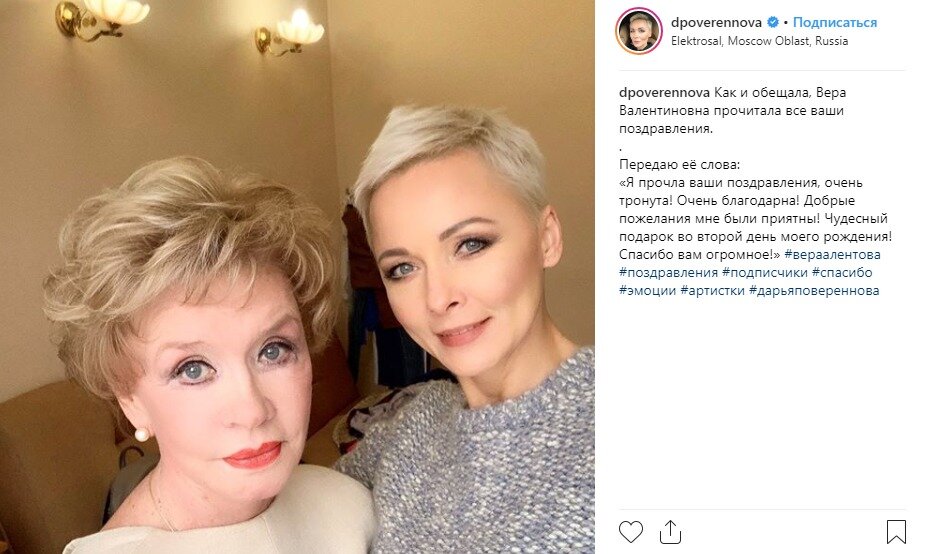 На своей официальной странице в социальной сети "Инстаграм" народная актриса России, на днях отметившая 77-летие, опубликовала свежую фотографию. На кадре Вера позирует вместе с коллегой по спектаклю "Роковое наследство" Дарьей Поверенновой. В подписи молодая артистка поблагодарила пользователей Сети, поздравивших Алентову с праздником.