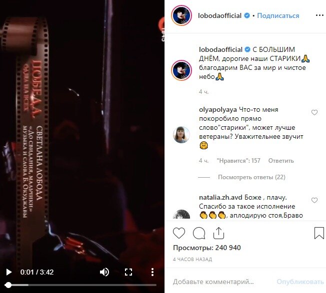 Многие украинские поклонники артистки поддержали Лободу в ее словах. Некоторые даже отмечали, что ее исполнение песни пробивает до слез. Однако нашлись и те, кому не понравилась сама фраза певицы. Они посчитали, что слово "старики" следовало бы заменить на "ветераны". Так, по их мнению, звучит более корректно.