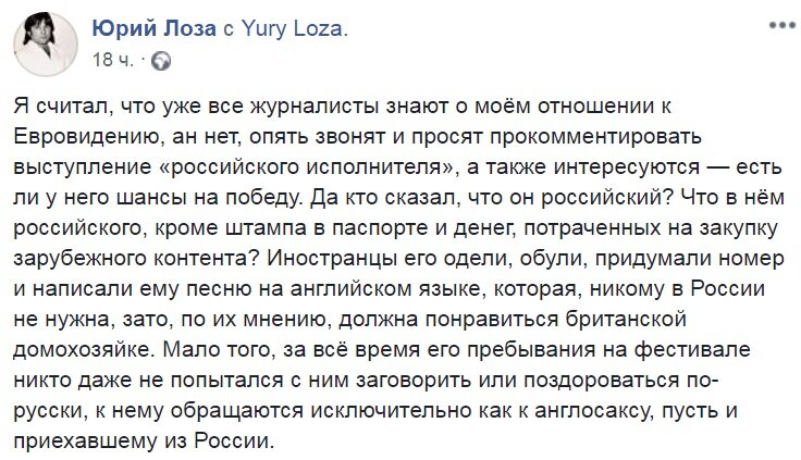 Певец Юрий Лоза усомнился, что представитель нашей страны на "Евровидении - 2019" Сергей Лазарев является российским исполнителем. Об этом он написал на своей страннице в Facebook, отвечая на вопросы журналистов, есть ли у России шанс на победу в конкурсе, передает "Российский Диалог".