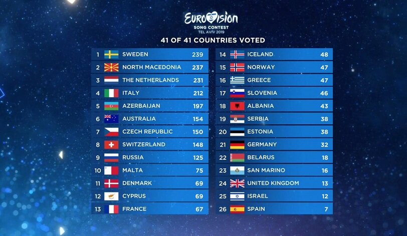 После голосования жюри (41 страна) сложилась довольно неожиданная картина – лидировала Швеция (Джон Лундвик) с 239 голосами, за ней Северная Македония (Тамара Тодевска) – 237 голосов и третье место у представителя Нидерландов Дункана Лоуренса – фаворита букмекеров.