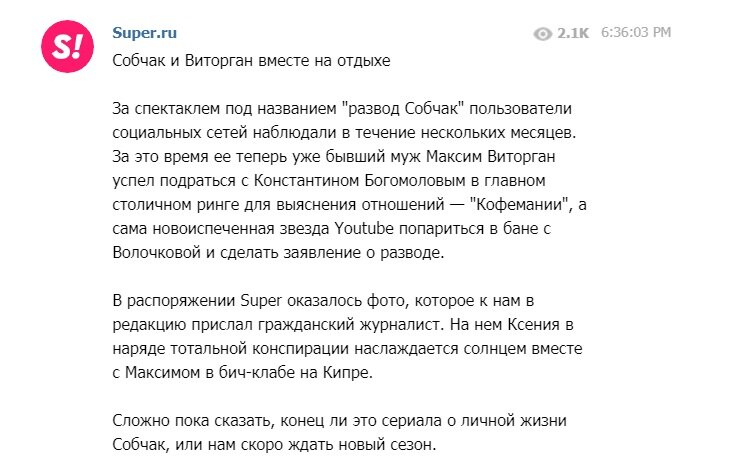 "В распоряжении Super оказалось фото, которое к нам в редакцию прислал гражданский журналист. На нем Ксения в наряде тотальной конспирации наслаждается солнцем вместе с Максимом в бич-клабе на Кипре", - сказано в сообщении.