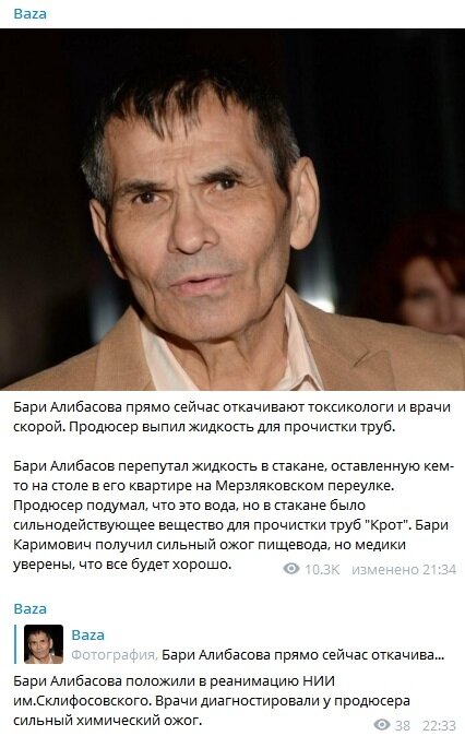 По полученной информации, опубликованной на официальной странице новостного портала Baza в социальной сети Telegram, Бари Алибасов перепутал жидкость в стакане, оставленную кем-то на столе в его квартире на Мерзляковском переулке.