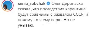 В подписи к снимку звезда написала, что знаменитый российский бизнесмен и олигарх Олег Дерипаска прогнозирует ужасные последствия для страны после окончания эпидемии вируса.. По его словам, последствия карантина для России можно будет сравнить с распадом Советского Союза.