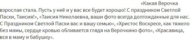 В официальном микроблоге "Инстаграм" мамы покойной исполнительницы Таисии появились фотографии ее дочери Веры с празднования Пасхи. Как известно, уже 13-летняя девушка после смерти матери живет с бабушкой и дедушкой.