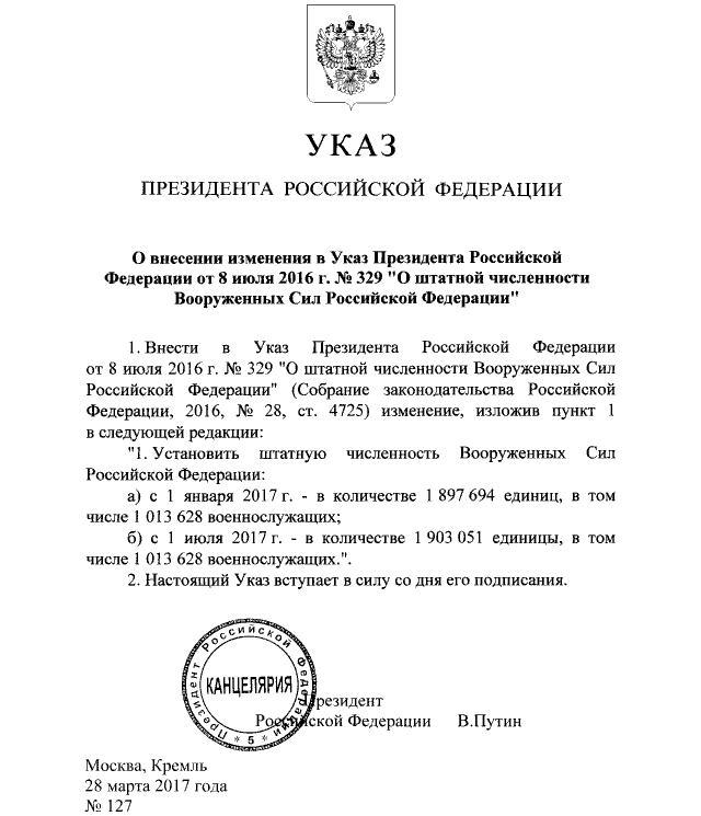 Начиная с июня нынешнего года количество армейцев будет увеличено до 1 миллиона 903 тысяч человек. Данным документом общая численность армии РФ установлена в 1 миллион 13 тысяч 628 человек.