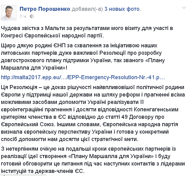 По словам Порошенко, он готов обсудить вопрос "создания плана Маршала для Украины" во время следующих контактов с лидерами европейских государств, сообщает "Российский Диалог".