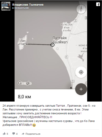 Сообщается, что осуществить задуманное Владислав Тынкачев планирует ранним утром в понедельник, 24 апреля. Заплыв он начнет от Паттайи до острова Ко Лан. Данное расстояние составляет 8 километров.