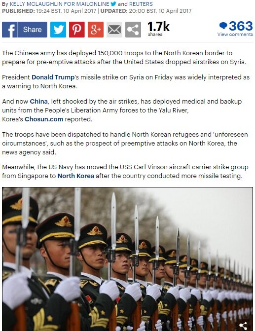 По информации издания, 150 тысяч человек личного состава китайской армии выдвинулись к границе с КНДР исключительно с гуманитарной миссии. Пекин не исключает большое количество беженцев после возможного упреждающего удара Соединенных Штатов, перебрасывая группу военнослужащих на случай "непредвиденных обстоятельств".