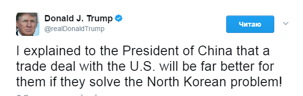 По словам Трампа, он объяснил председателю КНР, что торговая сделка удовлетворит Пекин, если китайская сторона поможет в решении "проблемы КНДР".