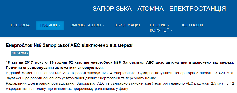 Как сообщает "Российский Диалог", отключение случилось сегодня вечером. По данным официального ресурса атомной электростанции, аварийное срабатывание автоматики на 6-м энергоблоке произошло в 19:52 по киевскому времени.