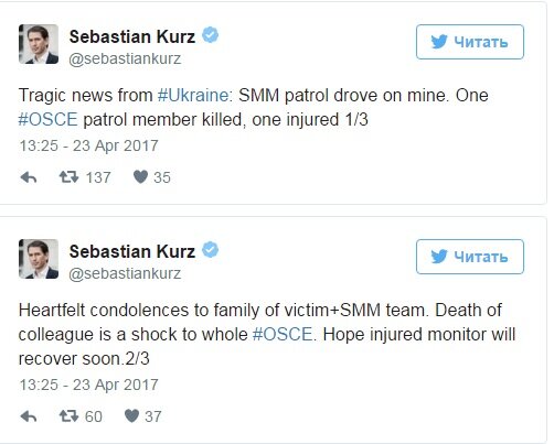 "Смерть коллеги является шоком для всей ОБСЕ. Надеюсь, что раненый наблюдатель вскоре поправится", - написал Курц на своей страннице в "Твиттере".
