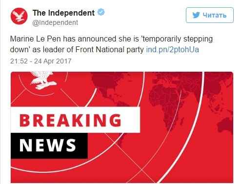 Как передает британская газета Daily Mail, лидер французских националистов заявила о сложении своих полномочий после того, как стали известные окончательные результаты первого тура президентских выборов, сообщает "Российский Диалог".
