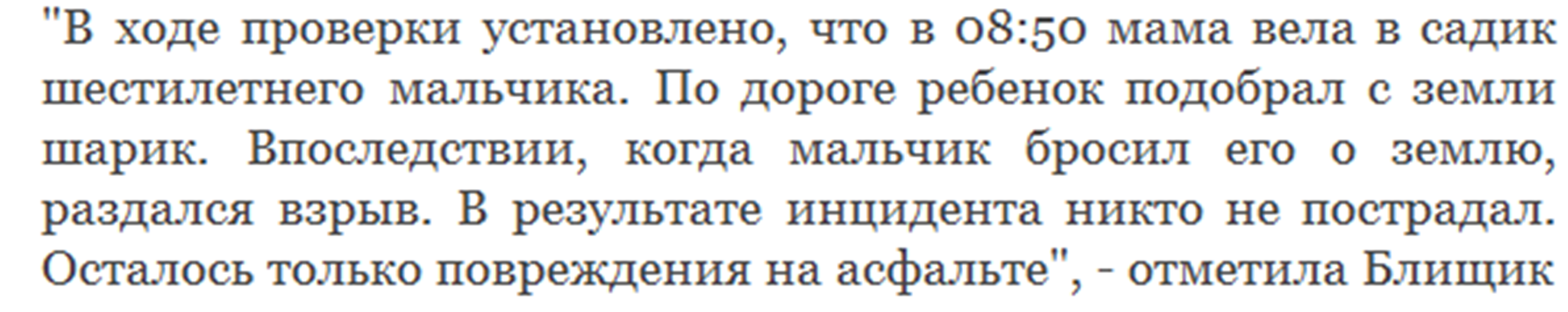 К счастью, ребенок и его мама не пострадали. Сейчас с 6-летним мальчиком работают психологи. На месте взрыва остались повреждения на асфальте.