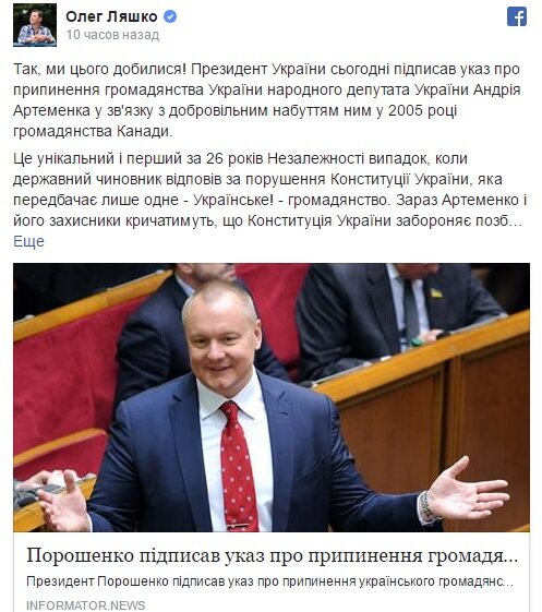 По словам Лчшко, поводом для лишения Артеменко украинского гражданства стало наличие у него канадского паспорта еще с 2005 года, что противоречит Конституции страны. Лидер радикалов обрадовался подписанному Порошенко указу, заявив, что его фракция в Верховной Раде намерена добиться лишения гражданства и других чиновников, имеющих какие-либо паспорта, кроме украинского.