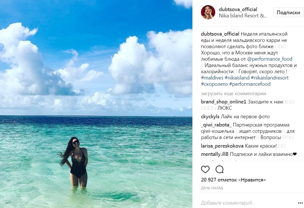 "Неделя итальянской еды и мальдивского карри не позволяют сделать фото ближе", - высказалась знаменитость в комментарии к снимку. Также артистка выложила фотографию, на которой она позировала в стильном слитном купальнике на пляже.