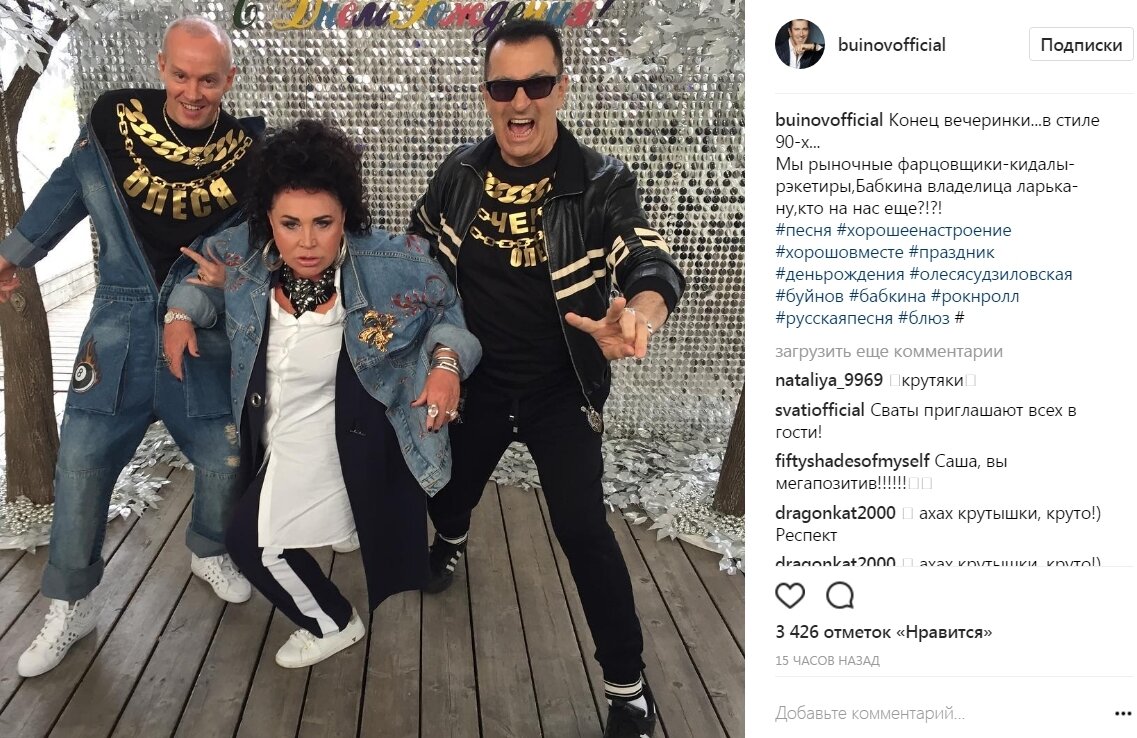 Оказалось, что на вечеринке гости должны были появиться в костюмах 90-х. Буйнов появился в спортивном костюме и кожаной куртке с вставками под золото, а вот Надежда Бабкина выбрала более оригинальный наряд. Она появилась в спортивных штанах, джинсовой куртке со стразами и белом джемпере. Завершающими штрихами образа стали массивные аксессуары и необычная прическа.