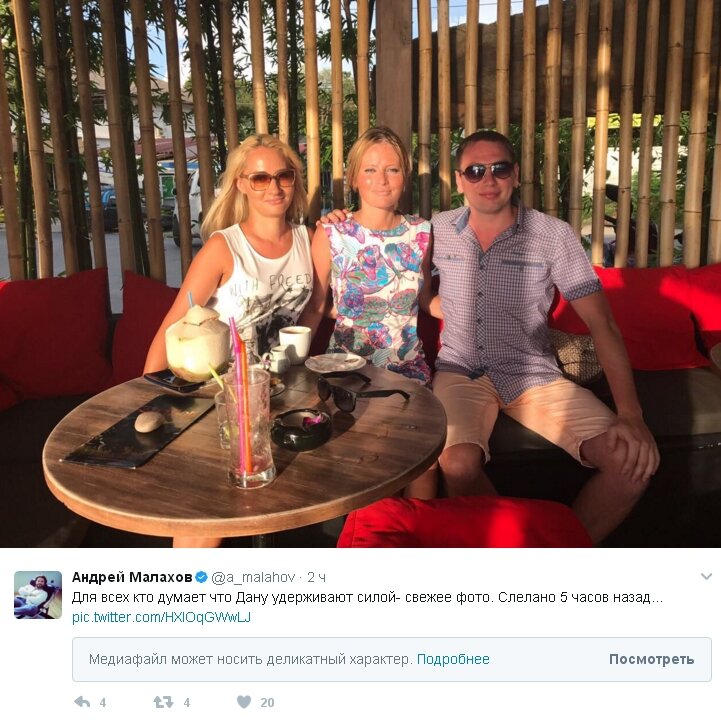 Эту новость увидел Андрей Малахов, который принимал участие в отправке звезды на лечение. "Первый канал" полностью покрыл немалые расходы на нахождение Борисовой в клинике. Телеведущий опубликовал на своей официальной странице в "Твиттере" фотографию довольной, счастливой и загорелой Даны. Под фотографией он сообщает, что кадр сделан всего 5 часов назад и те, кто верит в то, что девушку удерживают там силой, могут наглядно убедиться в ее целостности. Видно, что лечебный отдых идет телеблондинке на пользу, она выглядит жизнерадостной.