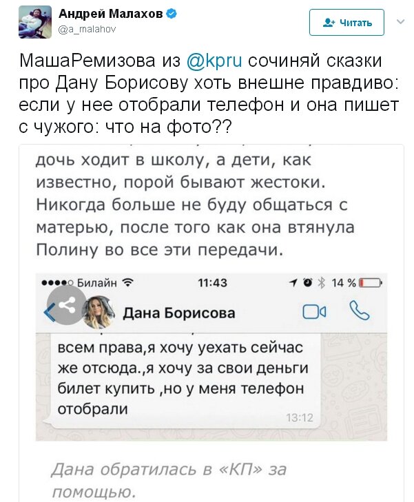 Ведущий ток-шоу не удержался и от комментария в сторону журналистки "Комсомольской правды", которая написала статью про желание сбежать Борисовой из лечебницы. На скрине, который выложила репортер, Андрей заметил одну не состыковку. А именно наличие фотографии Даны в профиле на якобы чужом телефоне.