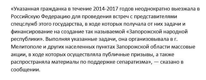 Следствие собирается привязать женщину к попытке создания Запорожской народной республики, оказанию России подрывной деятельности на территории Украины и привлечь к уголовной ответственности за государственную измену, что предусматривает лишение свободы сроком от десяти до пятнадцати лет.
