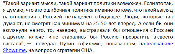 Однако Путин подчеркивает, это явно ошибочная политика, которая не нацелена в будущее. Такое мнение он высказал во время беседы с режиссером Оливером Стоуном.